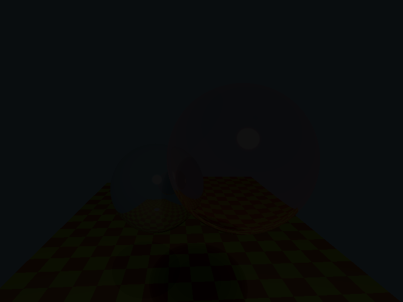Here are two images of our results. The first shows reflection on one sphere. The second applies the reflection to both spheres, and because our depth is three we get reflections of reflections of reflections. Hooray!