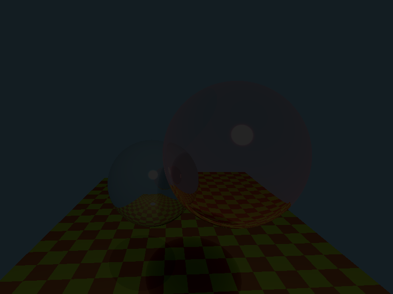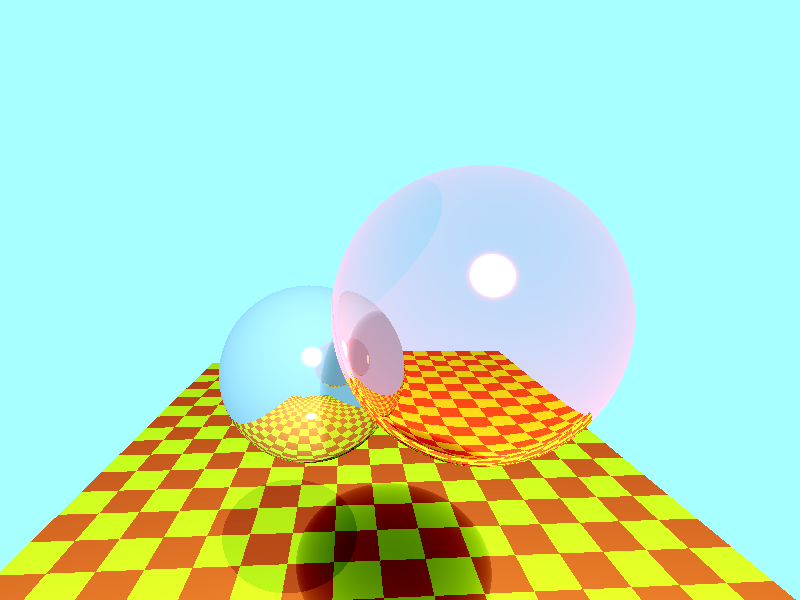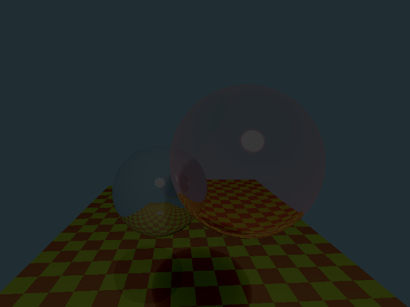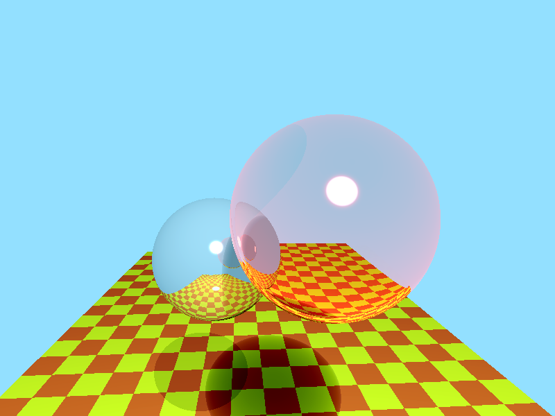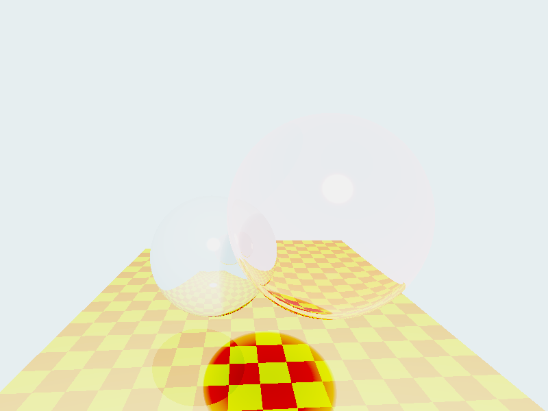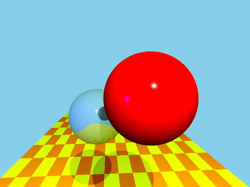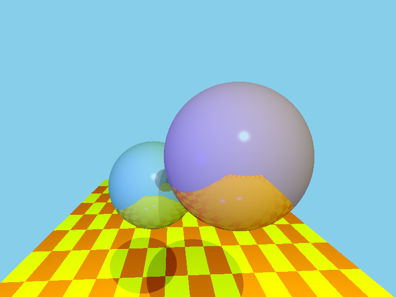 As you can see, it's not quite perfect. The important thing, however, is the refracting sphere has both the floor and the reflective sphere showing through it, and the reflective sphere reflects the floor and casts a shadow. The positions and sizes of our scene components can be found in the tables below.