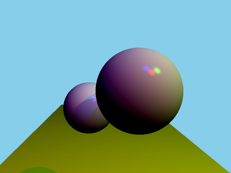 Here are two images of our results. The first shows a single white light in the scene. The second has 3 different color lights in a different place to show multiple light sources. The colors of the spheres in that example were changed to white and off-white to make the colored lights easier to see.