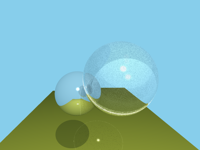 Not content with bouncing around the outside of our spheres, we ventured into the realm of transmissive rays. As seen below the larger sphere is now partially transparent. I ran into some difficulty programming this one. For a while, my refractions behaved just like reflections, and this discouraged me. With a little help (I find it much easier to debug when I can bounce ideas off of people!) I finally figured out that I was switching parity too often and in the wrong places. In the process of fixing it I got a little overzealous with my wiggle fudge-factor vector, as seen below.